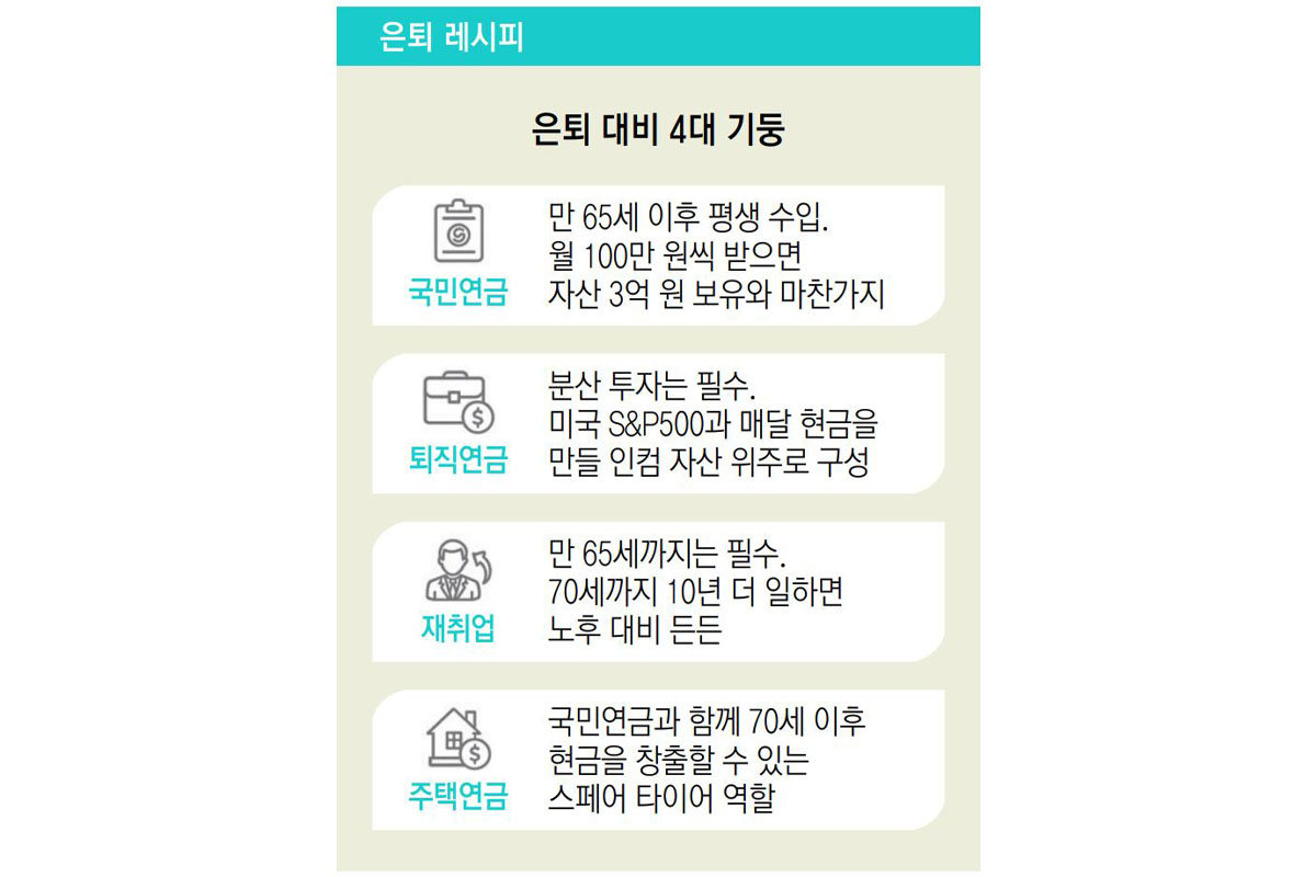 “금융자산 1억 원이라면 수익률 2%라 해도 연 200만 원에 불과합니다. 그런데 무리하게 투자하다 그나마 있는 재산을 털어먹습니다. 200만 원은 재취업해서 충당하고 자산운용은 덤이라 생각해야 합니다. 국민, 퇴직, 주택연금에 재취업을 통한 소득 확보가 가장 이상적인 대책입니다.”