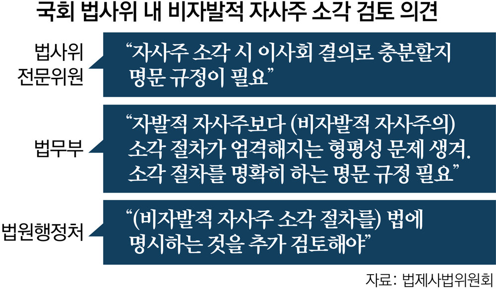 전문위원은 법사위 소속 의원들의 입법을 지원하는 입법 전문 공무원이다. 법무부와 법원행정처 역시 비자발적 자사주 소각과 관련해 별도 명문 규정이 필요한지 따져봐야 한다고 검토 의견을 냈다.