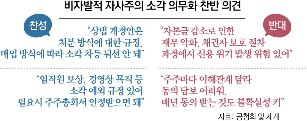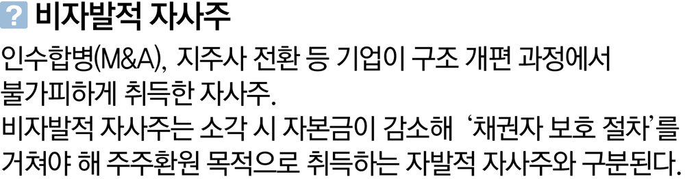 그간 기업들은 일반적인 자사주와 달리 기업 인수합병(M&A) 등으로 발생한 비자발적 자사주를 일괄 소각하면 유동성 압박으로 이어질 수 있다며 소각 의무에서 제외해 줄 것을 호소해 왔다. 비자발적 자사주 소각 시 자본금이 줄어들게 돼 채권자들이 문제를 제기할 수 있기 때문이다.