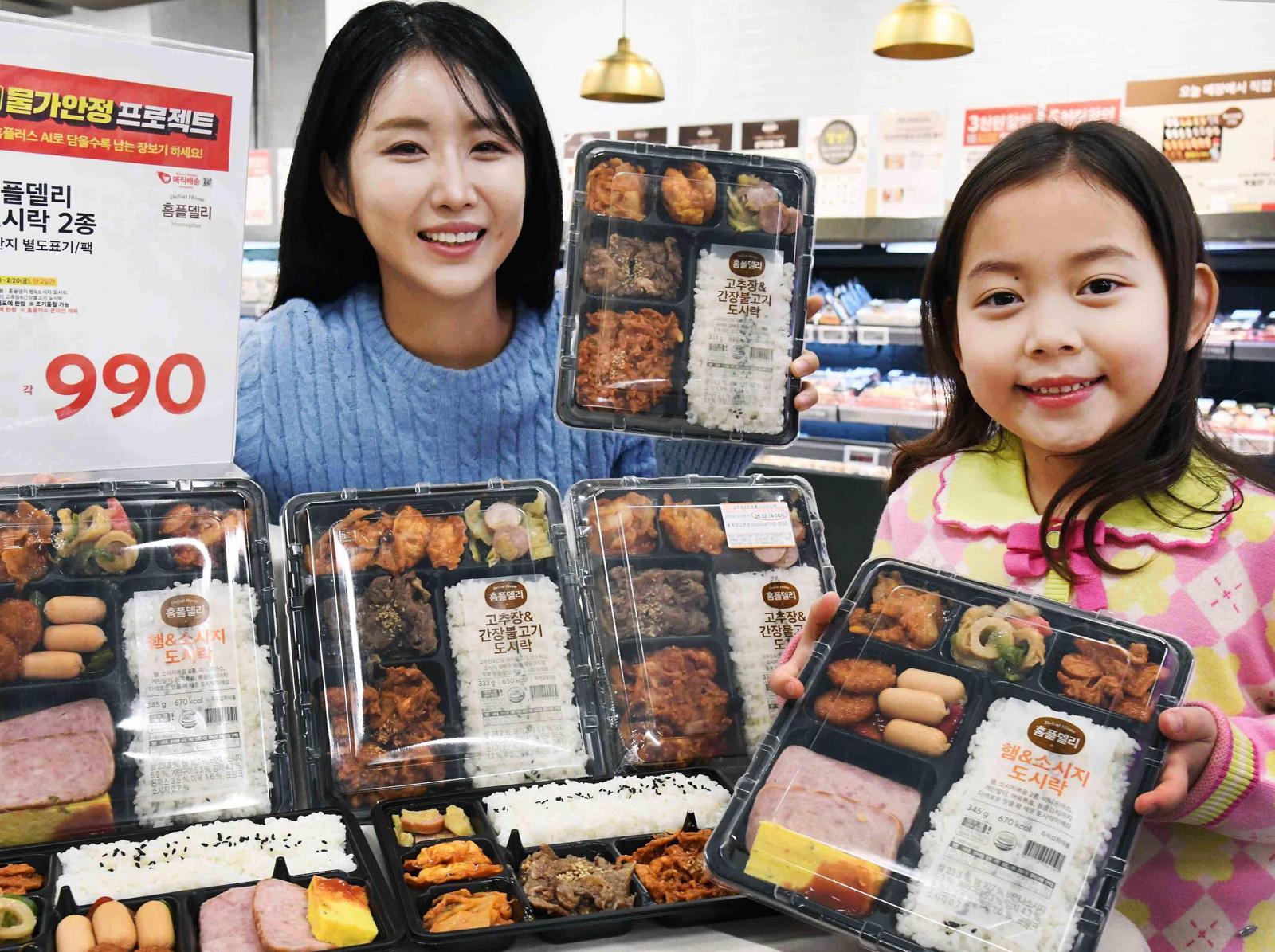 19일 서울 강서구 홈플러스 메가푸드마켓 강서점에서 모델들이 ‘홈플델리 도시락’ 2종 세트를 소개하고 있다. 홈플러스는 19∼20일 이틀 동안 홈플델리 도시락 2종을 각 990원에 판매하는 행사를 진행한다.