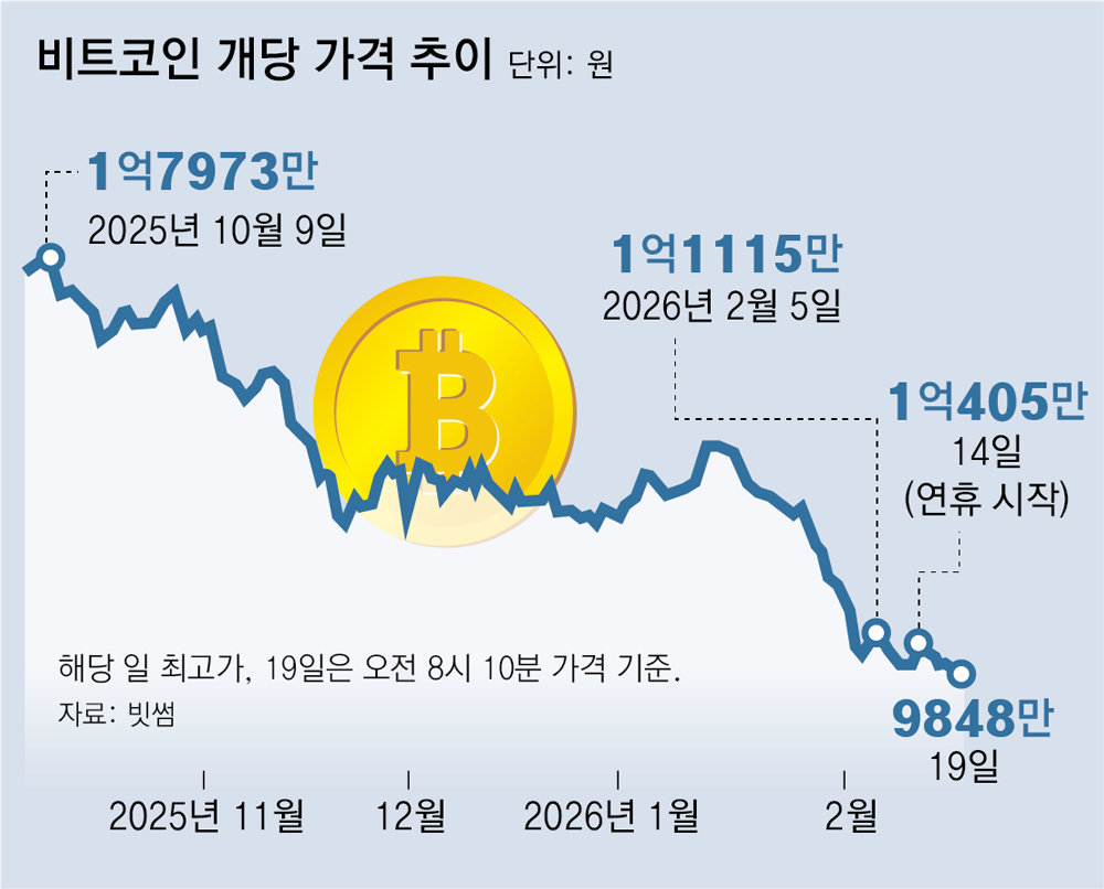 비트코인은 지난해 10월 9일 1억7973만 원까지 올랐지만 등락을 반복하다가 이달 초에 1억 원 선이 무너졌다. 설 연휴가 시작된 14일 1억265만 원으로 다시 돌아오긴 했지만, 연휴가 끝난 뒤 그동안의 반등분도 상당 부분 반납하며 다시 1억 원 아래로 내려앉았다.