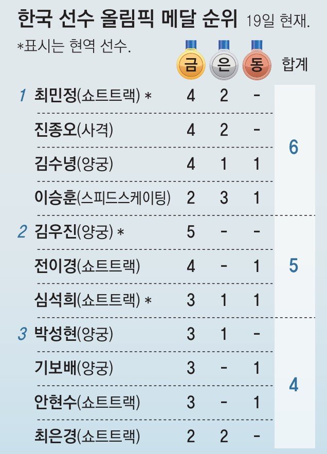 최민정은 19일 열린 2026 밀라노-코르티나담페초 겨울올림픽 쇼트트랙 여자 3000m 계주에서 금메달을 목에 걸면서 통산 올림픽 메달을 6개(금 4개, 은메달 2개)로 늘렸다. 이로써 최민정은 한국 선수 올림픽 메달 순위에서 진종오(47·사격), 김수녕(55·양궁), 이승훈(38·스피드스케이팅) 등과 공동 1위가 됐다. 또한 전이경(50)과 함께 한국 쇼트트랙 선수 중 가장 많은 올림픽 금메달을 목에 건 선수로 이름을 올렸다.