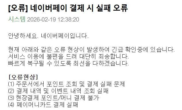 19일 낮 12시부터 오후 3시 30분까지 네이버페이를 이용한 결제와 예약 등 일부 서비스에서 오류가 발생했다. 오류가 발생한 기능은 △주문서에서 포인트 조회 및 결제 △결제 내역 및 이벤트 내역 조회 △현장결제 포인트 및 머니 결제 △페이머니카드 결제 등이다.