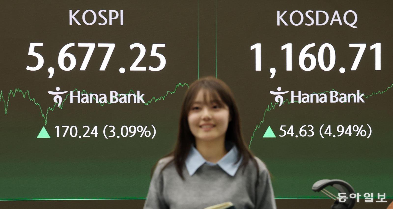 이날 코스피는 전 거래일 대비 3.09% 오른 5,677.25에 장을 마쳤다. 기관투자가가 1조6377억 원어치를 순매수하며 코스피 상승을 이끌었다. 코스닥지수도 전 거래일 대비 4.94% 오른 1,160.71에 마감했다.