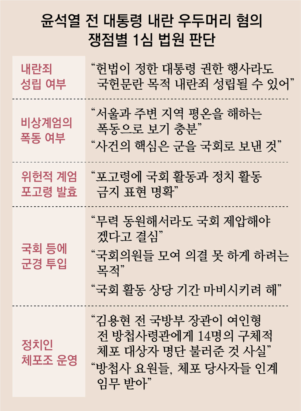 다만 재판부는 “원칙적으로는 대통령의 비상계엄 선포 자체는 내란죄에 해당할 수 없다”며 “사법 심사의 대상이 된다고 보기도 어렵다”고 했다. 하지만 법원은 윤 전 대통령 등은 국헌문란 목적을 갖고 폭동을 일으켜 내란죄를 저질렀다고 판단했다. 재판부는 “군이 무장해서 국회로 출동하는 자체, 헬기를 타거나 담을 넘어 국회로 진입하는 행위 자체, 그 안에 있는 관리자와 몸싸움을 하는 자체 등이 모두 폭동”이라고도 설명했다.