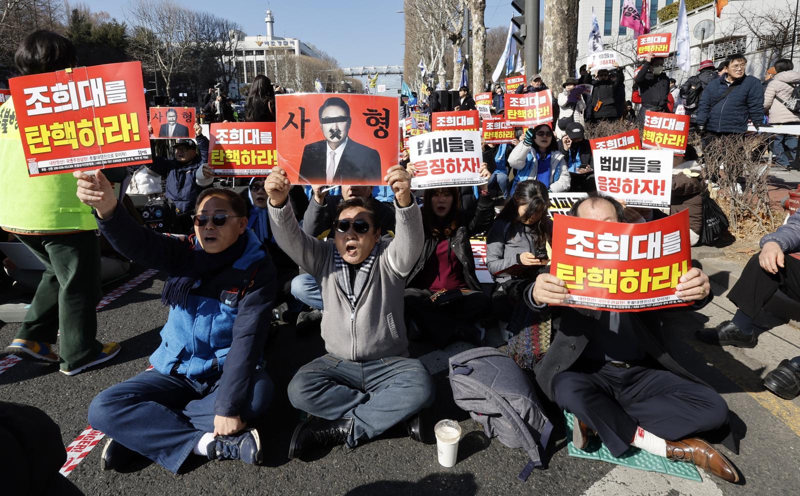 19일 서울 서초구 서울중앙지방법원 인근에서 윤석열 전 대통령 지지자들이 구호를 외치고 있다. 2026.2.19 뉴스119일 윤석열 전 대통령 등 내란 피고인들에 대한 선고가 내려진 서울 서초구 서울중앙지법 인근에서는 중형을 촉구하는 진보 단체와 무죄 방면을 주장하는 보수 단체 집회가 각각 열려 2500여 명이 몰렸다.