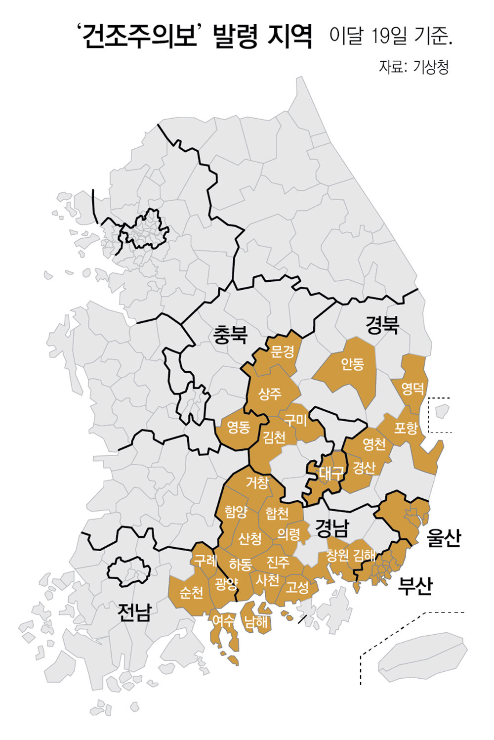 부산과 울산, 경북 지역에 내려진 건조특보는 이달 16일까지 53일간 유지되며 사상 최장 기록을 세웠다. 건조특보는 16일 비가 내려 잠시 해제됐다가 이틀 만에 다시 내려진 상태다.