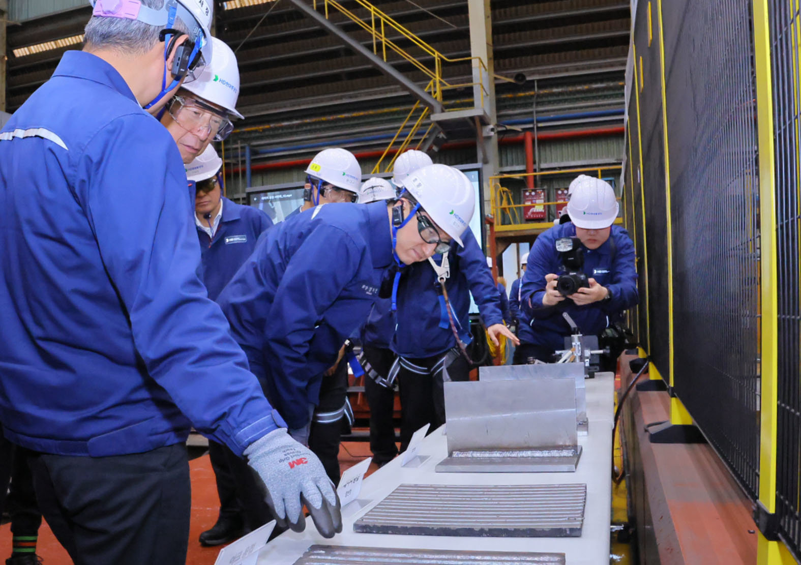 정기선 HD현대 회장이 16일 HD현대중공업 울산조선소 함정·중형선사업부를 방문한 모습. HD현대 제공정 회장은 이번 방문에서 ‘스마트 조선소’ 구축을 위한 진행 상황을 꼼꼼히 확인했다. HD현대는 2030년까지 AI·로봇 기반의 지능형 자율 운영 조선소를 구축하겠다는 구상을 갖고 있다. 이날 정 회장은 AI·로봇 기반 자율 제조 시스템 적용을 추진하고 있는 현장부터 휴머노이드 로봇 실증, 자율 이동형 전동레일 협동로봇 운영 현황 등을 직접 살폈다. 특히 정 회장은 선박 설계 도면과 생산 공정을 연동한 디지털 트윈 기술 적용 현장에 특히 관심을 보인 것으로 전해졌다.