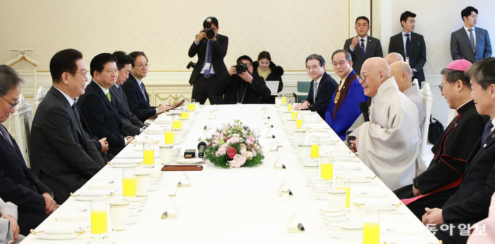 이 대통령은 모두발언에서 “우리 사회에 갈등과 혐오, 증오가 늘고 있다”며 “국민을 통합하는 것이 대통령의 가장 중요한 역할”이라고 말했다. 이어 “종교의 본질은 사랑을 실천하는 것인 만큼, 국민들이 서로 화합하고 포용할 수 있도록 종교 지도자들의 역할을 부탁드린다”고 했다.