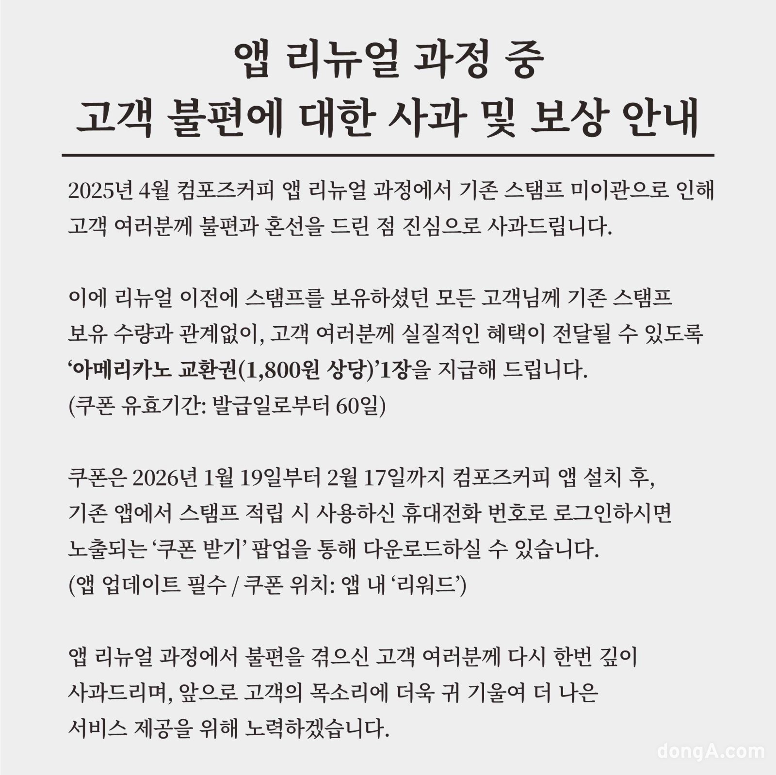 다만 이 과정에서 기존에 적립된 스탬프가 이관되지 않으면서 일부 고객에게 혼선과 불편이 발생한 점을 인정했다.
