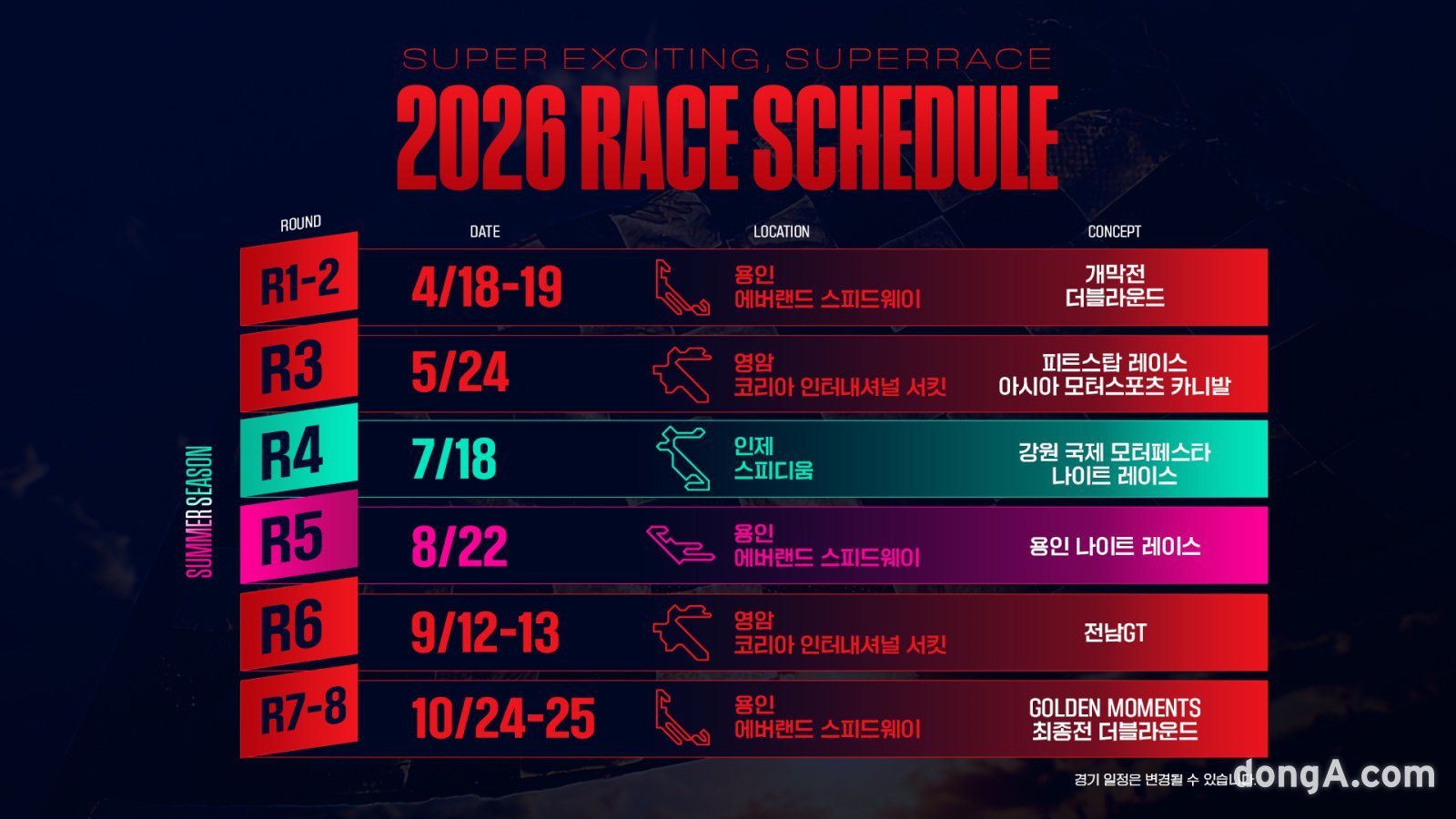 CJ대한통운이 타이틀 스폰서로 참여하는 ‘2026 오네 슈퍼레이스 챔피언십’은 총 8라운드로 구성된다. 용인 에버랜드 스피드웨이와 영암 코리아 인터내셔널 서킷, 인제 스피디움을 순회하며 개최된다. 시즌 개막전과 최종전은 모두 더블라운드로 편성돼 시즌 초반과 후반의 경쟁 구도를 한층 끌어올릴 전망이다.