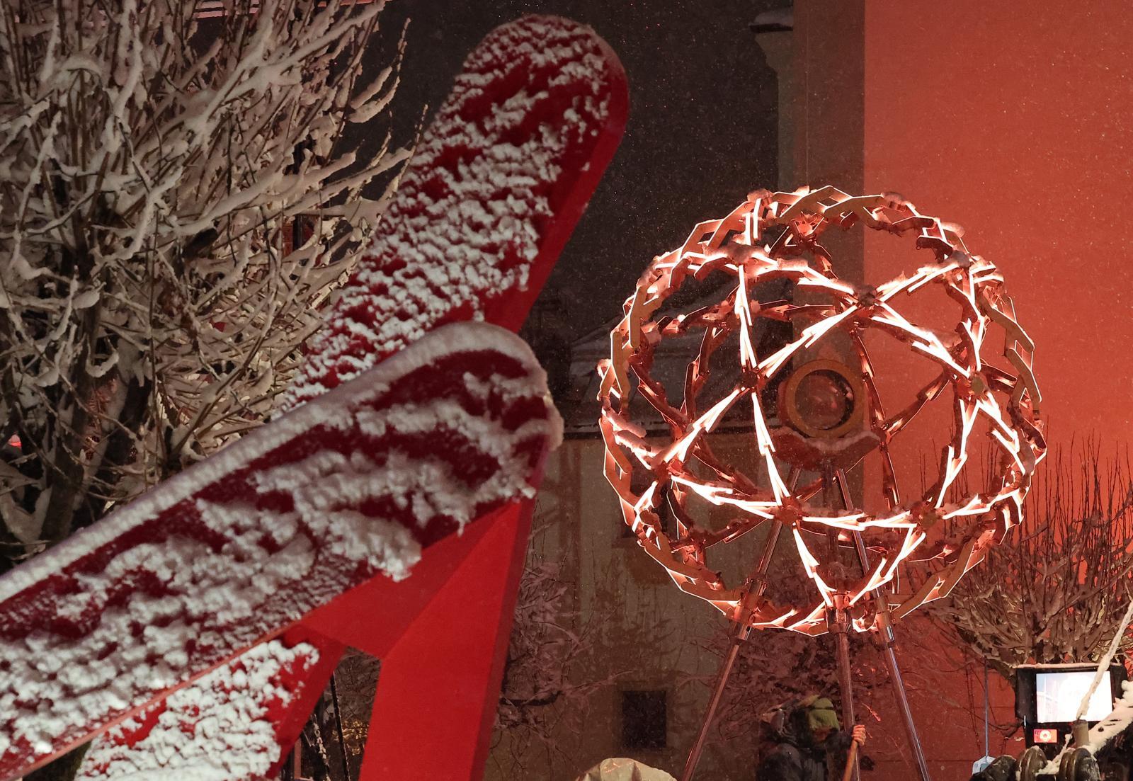 2026 밀라노·코르티나담페초 동계올림픽 개막을 이틀 앞둔 4일(현지시간) 이탈리아 코르티나담페초 광장에 설치된 성화대 뒤로 눈이 내리고 있다. 2026.2.5/뉴스1