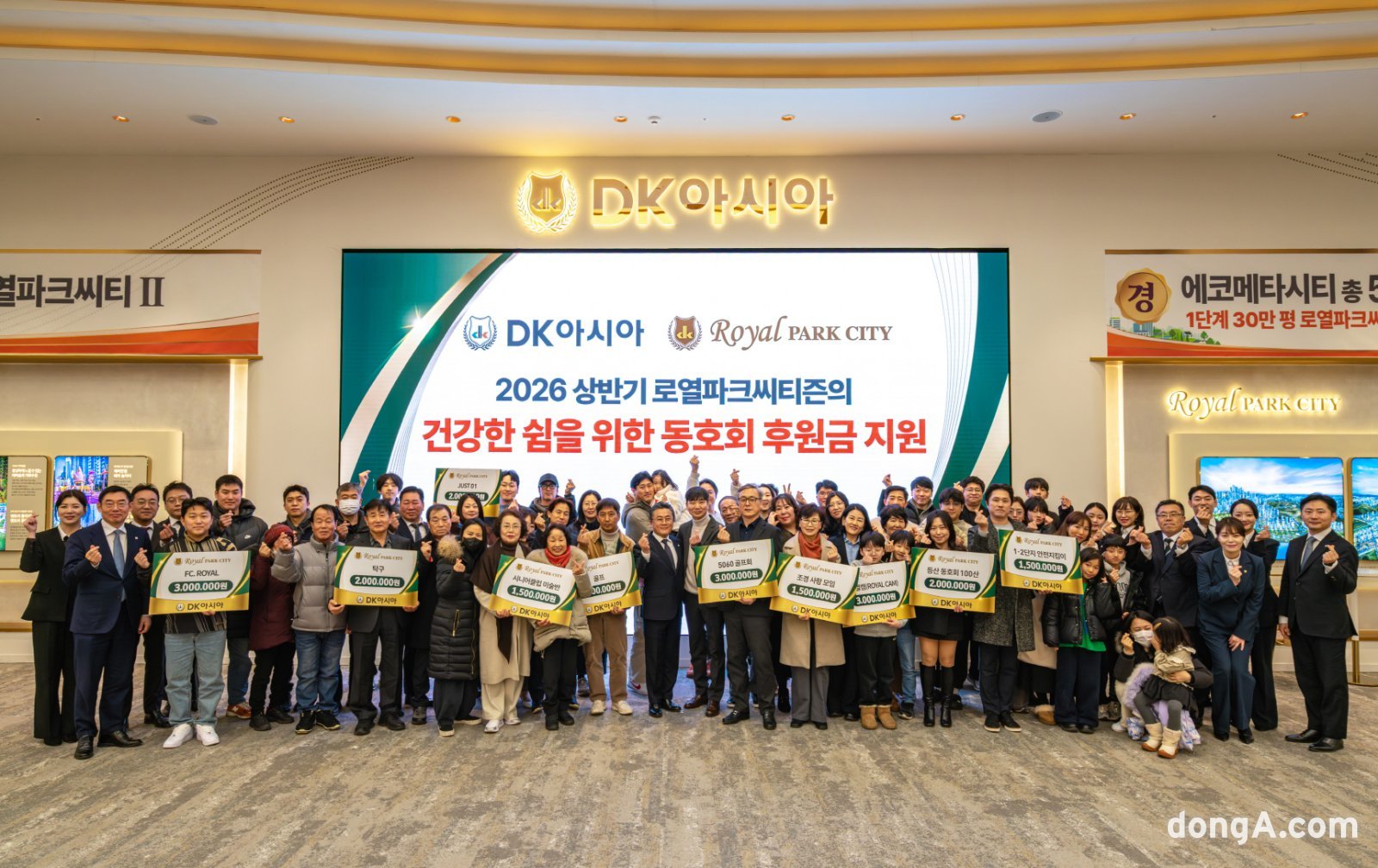 DK아시아가 신검단 로열파크씨티Ⅱ 주택전시관에 입주민 대상 ‘2026 상반기 로열파크씨티 동호회 후원식’을 개최했다. 이번 행사는 지난해 8월 12개 입주 우수 동호회를 선정해 후원을 진행한 데 이어 올해도 마련되는 자리다. 아파트 단지 차원의 동호회 후원을 정례화한 사례는 국내 건설·부동산 및 시행업계에서 최초이자 유일하다. 이날 행사에는 조재만 DK아시아 대표를 비롯해 입주자대표회의 대표, 우수 동호회 회장과 회원들이 참석했다.
