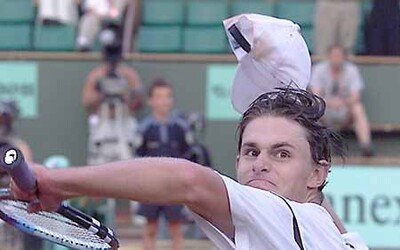 프랑스오픈에서 미국의 앤디 로딕이 마이클 창에게 3-2로 이긴 후 관중을 향해 모자를 던지고 있다.