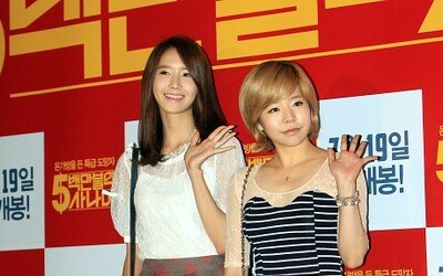 소녀시대 윤아와 써니(오른쪽)가 11일 오후 서울 왕십리 CGV에서 열린 `5백만불의 사나이`(감독 김익로) VIP 시사회에 참석해 영화 흥행 대박을 기원하고 있다.(서울=스포츠코리아)