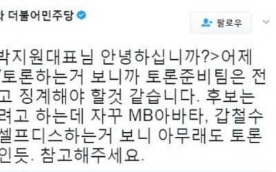 정청래 더불어민주당 전 의원은 ‘3차 TV대선토론’에서 안철수 국민의당 대선후보가 ‘갑철수, MB아바타’를 언급한 것에 대해 "(안 후보측)토론준비팀을 전면 교체해야 할것 같다"고 비난했다. 정 전 의원은 24일 트위터에"<박모닝, 박지원대표님 안녕하십니까?>어제 안후보 TV토론하는거 보니까 토론준비팀은 전면 교체하고 징계해야 할것 같습니다. 후보는 미래로 가려고 하는데 자꾸 MB아바타, 갑철수 얘기하며 셀프디스하는거 보니 아무래도 토론팀이 문제인듯. 참고해주세요"라고 글을 올렸다. 전날 대선후보 TV 토론회에서 안 후보는 문 후보에게 “제가 갑철수입니까, 안철수입니까”라고 질문을 던졌다. 이에 문 후보가 “무슨 말인가”라고 되묻자 안 후보는 문서를 꺼내들고 “이것이 민주당의 네거티브 문건”이라며 “조직적으로 국민 세금을 갖고 네거티브 비방한 증거가 다 있다”고 말했다. 안 후보는 또 "제가 MB아바타입니까"라고도 물었다. 이에 문 후보는 는 "항간에 그런 말들이 있다. 방금 안 후보가