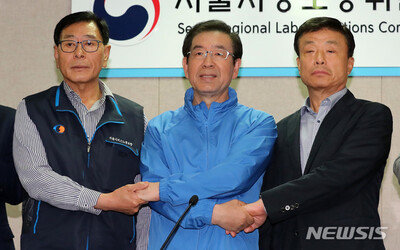 박원순 서울시장은 15일 서울시 버스노사 협상 타결과 관련해 “당분간 버스 요금 인상은 없다”고 강조했다. 박 시장은 이날 오전 CBS 라디오 ‘김현정의 뉴스쇼’에 출연해 “요금 인상 없이 적절한 임금 인상을 통해서 파업은 막았다는데 의미가 있다”며 이같이 밝혔다. 한국노총 산하 전국자동차노동조합연맹 소속 서울시버스노동조합과 사측인 서울시버스운송사업조합, 버스 준공영제를 통해 버스회사들을 재정적으로 지원하는 서울시는 14~15일 서울지방노동위원회에서 열린 제2차 지방노동위원회 조정회의에 참석, 11시간에 걸친 진통 끝에 노사합의를 이끌어냈다. 양측은 2019년 임금을 3.6% 인상하고 현행 만 61세인 정년을 2020년 만 62세, 2021년 만 63세로 늘리기로 했다. 올해 5월31일까지 지급키로 했던 학자금 등 복지기금 조성은 5년 연장해 20224년 5월31일까지 지급한다. 금액은 연 36억400만원이다. 2020년부터는 사업장 규모와 관계없이 관공서의 공휴일에 관한 규정이 적용된다.