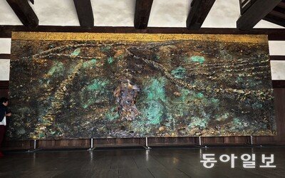 3일 일본 교토에 있는 유네스코 세계유산 니조(二条)성. 여기에 있는 일본 막부시대 쇼군(將軍)의 궁전 ‘니노마루 고텐’은 화려한 금박 장식 등으로 평소 니조성의 하이라이트로 꼽힌다. 하지만 대형 부엌과 조리실(다이도코로, 오세이쇼)은 다소 어둡고 차분한 분위기의 목조 건축물로 평소 일반에 공개되지 않는 곳. 이날 건물 안에 들어서자 폭 9.5m, 높이 3.8m 대작 회화 ‘옥타비오 파스를 위하여’가 압도적 분위기를 내뿜었다. 이 작품은 세계적 거장인 독일 출신 미술가 안젤름 키퍼가 3월 31일부터 개최한 개인전 ‘솔라리스’에서 새로 공개한 신작이다. 키퍼가 아시아에서 연 최대 규모의 전시에 어울리는 크기이다. 히로시마와 나가사키 원자폭탄 폭격의 비극에서 영감을 얻은 회화부터 과학과 신화, 종교에 대한 사색을 담은 작품까지 총 33점을 선보인 이번 전시를 현장에서 둘러봤다.● 죽음과 황금이 섞인 매혹적인 폐허 키퍼는 ‘20세기의 레오나르도 다빈치’로 불리는 요제프 보이스(1921∼1