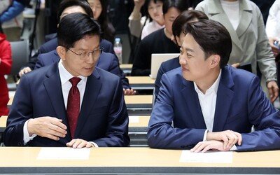 지지율 정체에 빠진 국민의힘 김문수 대선 후보가 개혁신당 이준석 대선 후보와의 단일화를 위한 마지막 불씨 지피기에 나섰다. 김 후보와 이 후보는 19일 국민의힘 소속 오세훈 서울시장이 주재한 토론회에 함께 참석했다. 김 후보는 이 자리에서 전날 열린 대선 첫 TV토론을 언급하며 “어제 토론의 MVP는 이준석이었다”고 말했다. 김 후보가 이 후보를 치켜세우며 ‘단일화 러브콜’을 띄운 것이다. 하지만 이 후보는 “단일화 논의 자체에는 전혀 관심이 없다”고 일축했다. 6·3 대선이 2주 앞으로 다가오자 국민의힘은 두 후보의 단일화를 대선 판도를 흔들 수 있는 마지막 반전 카드로 보고 단일화 성사에 총력전을 펼칠 태세다. 하지만 이 후보는 단일화에 거리를 두고 있다.● 金 “우리 당이 잘못해서 李와 헤어져” 김 후보는 이날 서울 중구 서울시청에서 열린 ‘약자와 동행하는 서울’ 토론회 인사말에서 “이 후보는 제가 속한 국민의힘 대표였다”며 “우리 당이 그동안 잘못해서 이 후보가 밖에 나가서