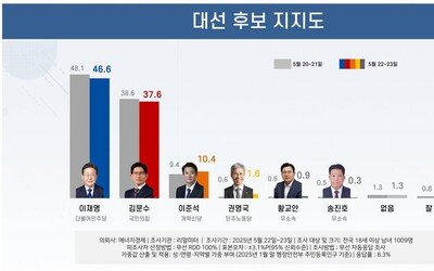 21대 대통령 선거 후보 지지도 조사에서 이재명 더불어민주당 후보가 46.6%, 김문수 국민의힘 후보가 37.6%로 두 후보 간 격차가 10%포인트 이내로 좁혀졌다는 여론조사 결과가 24일 나왔다.여론조사 전문회사 리얼미터가 에너지경제신문 의뢰로 지난 22~23일 전국 18세 이상 유권자 1009명을 대상으로 실시해 이날 발표한 5월 4주차 주간동향 조사에서 대선 후보 지지도는 이재명 후보는 46.6%, 김문수 후보는 37.6%, 이준석 개혁신당 후보 10.4% 등으로 조사됐다.이어 권영국 민주노동당 후보(1.6%), 황교안 무소속 후보(0.9%), 송진호 무소속 후보(0.3%) 등의 순이다. 5월 3주차(14~16일) 조사와 비교해 이재명 후보는 3.6%포인트 하락한 반면 김문수 후보는 2.0%포인트 상승했다. 이준석 후보도 1.7%포인트 올랐다. 이재명 후보와 김문수 후보 간 격차는 5월 3주차 조사 당시 14.6%포인트에서 5월 4주차에는 9.0%포인트로 축소됐다.리