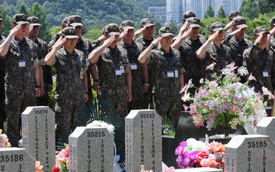 현충일을 하루 앞둔 5일 대전 유성구 국립대전현충원 천안함 46용사 묘역에서 군 장병들이 추모 경례를 하고 있다. 2010년 3월 26일 인천 백령도 근처 바다에서 해군 초계함 천안함이 북한 어뢰에 피격된 뒤 장병 40명이 숨졌고 6명이 실종됐다.