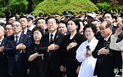 이재명 대통령은 6일 서울 동작구 국립서울현충원에서 열린 제70회 현충일 추념식에 입장하면서 앞줄에 선 참석자들과 일일이 악수했다. 지난달 29일 해군 P-3C 해상초계기 추락 사고로 산화한 고 박진우 중령의 유족은 눈물을 터뜨렸다. 멈춰 선 이 대통령은 유족을 위로하다가 ‘이제 이동하셔야 한다’는 말에 발을 뗐다. 이 대통령은 이날 추념사에서 초계기 순직 군인인 박 중령과 이태훈 소령, 윤동규 상사와 강신원 상사, 2023년 12월 서귀포 감귤창고 화재 현장에서 순직한 임성철 소방장의 이름을 호명하며 “우리 국민께서는 고인들의 헌신을 뚜렷이 기억할 것”이라고 했다. 대통령실은 이들 유가족이 국가보훈부 초청 명단에는 없었으나 이 대통령의 지시로 특별 초청됐다고 밝혔다. ● 북한 언급 없이 “든든한 평화” 강조 이 대통령은 이날 대통령 취임 후 첫 현충일 추념사에서 “전쟁 걱정 없는 평화로운 나라, 일상이 흔들리지 않는 안전한 나라” “든든한 평화 위에 민주주의와 번영이 꽃피는 나라