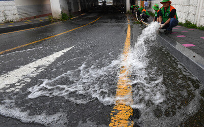 24일 오후 경북 포항시 북구 흥해읍 지하도에서 마을자율방재단이 배수 작업을 하고 있다. 장마가 시작된 가운데 포항시는 이날 ‘하천 붕괴·도시 침수 대응 주민 대피 훈련’을 실시해 재난 대응력을 점검했다.