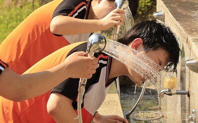 한낮 더위 32도가 넘는 폭염에도 친구들과 함께라면 지칠 틈이 없습니다. 찬물로 서로의 더위를 식히는 우정이 폭염보다 강하니까요. ―광주 동구 광주고에서