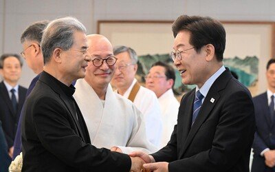 이재명 대통령이 9일 서울 용산 대통령실에서 열린 종교 지도자 초청 오찬 간담회에서 이용훈 한국천주교주교회의 의장주교(왼쪽), 대한불교조계종 총무원장 진우 스님(왼쪽에서 두 번째)과 인사하고 있다. 이 대통령은 “우리 사회가 지나치게 분열됐고 갈등이 격화됐다”면서 “종교 지도자들의 역할이 중요하다”고 했다. 종교 지도자 대표로 나선 진우 스님은 간담회에서 새 정부에 대한 제언이 이어지자 “참모들은 코피가 난다는데 대통령은 귀에서 피가 나겠다”고 농담하기도 했다.