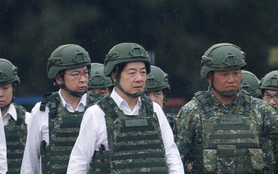 라이칭더 대만 총통(가운데)이 10일 대만 신주현에 있는 사격 훈련장을 둘러보고 있다. 대만군은 중국의 침공 가능성에 대비해 9일부터 9박 10일로 ‘한광 41호 훈련’을 진행 중이다. 10일 이 훈련에 참여해 발포 중인 M1A2T 에이브럼스 전차.