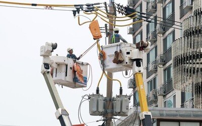 전봇대 하나에 기술자 두 분이 사다리차에 각각 올라타고 씨름합니다. 무더위에도 안정된 전기 공급을 위해 구슬땀을 흘리는 두 분께 감사한 마음을 전합니다. ―서울 강남구 압구정동에서