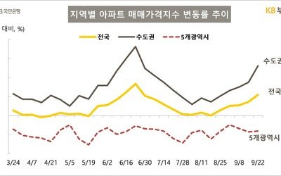 9·7 주택공급 대책 발표 이후에도 서울 집값이 한강벨트 중심으로 5주 연속 상승폭을 키워가고 있다. 1기 신도시 재건축 호재가 있는 경기도 성남시 분당도 1주 전보다 1.16% 오르며 올해 들어 가장 높은 상승률을 보였다.25일 KB부동산이 발표한 주간 아파트 시장 동향에 따르면 지난 22일 기준 전국 아파트 가격 변동률은 1주 전보다 0.05%, 수도권은 0.13% 상승했다. 전국 아파트 매매가격은 8월18일 0.00%→8월25일 0.01%→9월1일 0.03%→9월8일 0.03%→9월15일 0.04%→9월22일 0.05%로 5주 연속 오름세다. 상승률도 지난주보다 소폭 오르면서 3주 연속 상승폭이 확대됐다서울 아파트 매매가격은 0.34% 오르면서 5주 연속 상승폭이 확대됐다. 서울 아파트 매매가격은 8월18일 0.11%→8월25일 0.14%→9월1일 0.17%→9월8일 0.18%→9월15일 0.21%→9월22일 0.34%로 상승폭이 점차 켜졌다. 지역별로 광진구(0.9