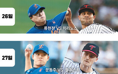 프로야구 선두 LG와 2위 한화가 26∼28일 한화의 안방 대전에서 한국시리즈 우승 확률 85.3%를 걸고 시즌 마지막 3연전을 치른다. 지난해까지 프로야구가 ‘계단식으로’ 포스트시즌을 치른 건 총 34번이다. 그중 29번은 정규리그 1위로 한국시리즈에 직행한 팀이 정상에 올랐다. 도전자 한화는 ‘미리 보는 한국시리즈’ 1차전 선발 투수로 ‘LG 킬러’ 류현진(38)을 내세운다. 류현진은 2006년 프로 데뷔 이후 LG를 상대로 통산 24승 9패 평균자책점 2.24를 기록 중이다. 올해는 1승 무패 0.95로 더 강했다. 이어 문동주(22)가 27일, 폰세(31)가 28일에 차례로 선발 마운드에 오를 예정이다. 김경문 한화 감독은 “폰세에게 하루 더 휴식을 주기 위해 문동주와 등판 순서를 바꿨다”면서 “그전에 (LG가 1위를 확정하는 방향으로) 최종 순위가 나오면 폰세가 등판하지 않을 수도 있다. 대신 순위 확정 전까지는 베스트 라인업으로 최선을 다할 계획”이라고 말했다. 한국 무대