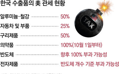 미국이 의약품에 이어 반도체와 전자제품 등에 대해서도 품목별 관세 부과에 나설 것이란 소식이 전해지면서 국내 기업들의 우려가 점점 더 커지고 있다. 반도체는 미국 생산량에 비례해 관세를 매기는 방안이 제기됐고, 전자제품은 제품 내에 들어있는 반도체 개수에 맞춰 관세 부과가 유력하다는 외신 보도가 나왔다. 한미 관세 협상의 최종 타결이 지연되면 스마트폰과 TV 등 한국 핵심 수출품의 대미 수출에 ‘빨간불’이 켜질 가능성이 있다. ● 반도체·전자제품도 관세 임박 26일(현지 시간) 월스트리트저널은 복수의 소식통을 인용해 “미국 내에서 제조한 반도체와 수입한 반도체 물량 비율을 1 대 1로 맞추는 것을 의무화하는 방안을 검토 중”이라고 보도했다. 가령 반도체 기업이 미국에서 반도체 100개를 생산하면, 이 회사가 미국으로 수입하는 반도체 100개에 무관세 혜택을 주는 것이다. 다만 이를 넘어설 경우 고관세를 매긴다는 것이 미국 정부의 생각이다. 같은 날 로이터통신은 “트럼프 행정부에서 전