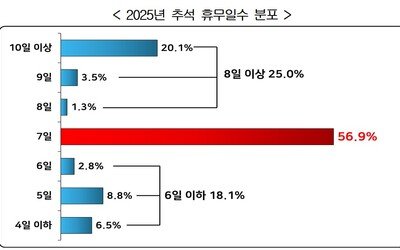 이번 추석에 휴무하는 기업 10곳 중 6곳은 7일간 쉰다는 조사 결과가 나왔다. 열흘 이상 쉬는 기업은 10곳 중 2곳이었다. 한국경영자총협회(경총)는 전국 5인 이상 625개 기업을 대상으로 한 ‘2025년 추석 휴무 실태조사’를 통해 이 같은 내용을 28일 발표했다. 올해 추석 휴무를 실시하는 기업의 56.9%가 개천절부터 한글날까지 7일 동안 쉬는 것으로 나타났다. 열흘 이상 쉰다는 응답이 20.1%로 그 뒤를 이었다. 한글날에 이어 금요일인 다음 달 10일까지도 휴무일로 정한 경우 직후 주말까지 쳐 총 열흘을 쉬는 것으로 경총은 분류했다. 다만 휴무 사유는 기업 규모별로 달랐다. 열흘 이상 휴무 예정인 300인 이상 기업은 ‘근로자 편의 제공’(40.0%)과 ‘단체협약, 취업규칙에 따른 의무적 휴무’(40.0%)라는 이유를 들었다. 반면 300인 미만 기업은 연차휴가 수당 등 비용을 절감하기 위한 차원(41.2%)이라고 주로 답했다. 한편 추석 상여금을 줄 계획인 기업