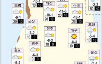 전국이 구름 조금 끼겠다. 아침 최저기온은 영하15도∼영상1도로 7일과 비슷하겠고 낮 최고기온은 영하2도∼영상7
