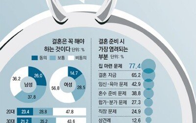 오늘날 결혼은 의무가 아니라 하나의 선택지에 불과한 것처럼 보인다. 결혼을 운명적인 일이라고 생각하거나, 결혼에 대한 특별한 환상을 갖지도 않는다. 현재의 청춘들은 결혼의 필요성 자체에 의문을 갖기 시작했다. 엠브레인 트렌드모니터의 조사 결과 결혼을 꼭 해야 한다고 생각하는 미혼 남녀는 10명 중 약 2명(20.3%)에 불과한 것으로 나타났다. 남성(26%)보다는 여성(14.7%), 그리고 40대 초반 미혼자(10.5%)가 결혼의 필요성을 더욱 느끼지 못했다. 무엇보다도 결혼 적령기라고 불리는 20, 30대 미혼자의 인식이 빠르게 변하고 있다는 점에 주목해볼 필요가 있다. 2014년 조사와 비교했을 때 결혼을 꼭 해야 한다는 생각을 가진 20, 30대 미혼자가 크게 줄어든(2014년 33.1%→2017년 22.3%) 것으로, 결혼의 필요성에 의문을 가지는 시점이 보다 빨라지고 있다는 해석을 가능하게 한다. 결혼에 대한 고민은 결국 ‘경제적 문제’와 맞닿아 있었다. 미혼 남녀 10명 중 8명(78