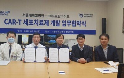 바이오 벤처기업 프로탄바이오(대표 조제열)이 최근 서울대병원(병원장 김연수)과 키메라 항원 수용체 T세포(CAR-T세포) 치료제 개발을 위한 업무협약(MOU)을 체결했다고 29일 밝혔다. CAR-T 항암면역 세포치료제는 환자의 혈액에서 면역 세포의 한 종류인 T세포를 꺼내 특정 암세포를 제거토록 유전자를 조작한 후 다시 환자에게 주입하는 환자 맞춤형 자가 세포치료제다. 이번 협약으로 서울대병원은 프로탄바이오가 개발하는 다발골수종 CAR-T 항암면역 세포치료제의 개발 및 평가기술, 임상시험 등에 관한 연구를 프로탄바이오와 공동으로 진행하게 된다. 프로탄바이오는 자사 보유의 특화된 항체 생산기술을 기반으로 기존 치료제의 부작용을 최소화할 수 있는 항체 개발을 완료하고 이를 기반으로 CAR-T 세포치료제를 개발 중이다. 현재 임상시험을 준비하는 단계다. 또 선택성과 결합력이 높은 항체를 개발해 고형암에서도 치료 효과를 기대할 수 있는 CAR-T 세포치료제를 개발 중이다. 프로탄바이