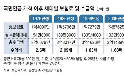 1일 국민연금법 개정안이 국무회의를 거쳐 공포됐지만 “젊은층에 불리한 개혁”이라는 20, 30대 불만은 사그라지지 않고 있다. 정부 세대별 손익 계산 추계에서도 평생 낸 돈 대비 총연금액을 뜻하는 ‘수익비’가 젊을수록 더 낮아지는 것으로 나타났다. 다음 정부에서 본격적으로 운영될 국회 연금개혁특별위원회(연금특위)에서 구조개혁 방향을 두고 진통이 예상된다. 전문가들은 “이번 개혁은 기금 고갈 시점을 8년 늦춘 것일 뿐, 연금특위에서 재정 지속 가능성을 위한 구조개혁 논의를 서둘러야 한다”고 했다.● 50세는 낸 돈 2.6배, 20세는 1.7배 받아 7일 국회 보건복지위원회 소속 김선민 조국혁신당 의원이 보건복지부에서 받은 ‘연금 개혁 시 보험료·연금액 변화’ 자료에 따르면 이번 연금 개혁으로 1976년생(연금 개혁이 시행되는 2026년 기준 50세)이 평생 내는 돈은 1억4090만 원, 총연금액은 3억6679만 원으로 추계했다. 총보험료는 964만 원, 총수급액은 522만 원이 늘어