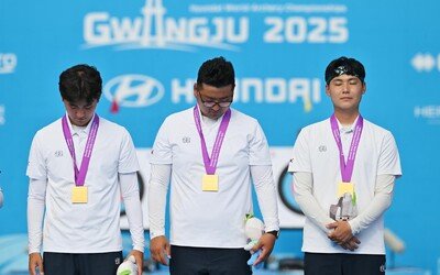 한국 양궁 리커브 남자 대표팀이 안방에서 열린 세계선수권에서 한국 선수단 첫 금메달을 따냈다. 지난해 파리 올림픽 남자 단체전 우승을 합작했던 김우진, 김제덕, 이우석이 다시 뭉친 남자 대표팀은 10일 광주 5·18 민주광장 특설경기장에서 열린 2025 광주 세계양궁선수권 남자 단체전 결승에서 미국을 세트 점수 6-0(56-55, 57-55, 59-56)으로 완파하고 금메달을 목에 걸었다. 2021 양크턴 대회, 2023 베를린 대회에 이어 3연패다. 첫 세 발을 모두 10점에 명중시키며 기선을 제압한 김제덕은 “저 혼자서는 그려낼 수 없는 결과였다. 형들이 당겨 주면 제가 뒤따라가면서 좋은 결과를 낸 것 같다”고 말했다. 현역 최고 궁사로 인정받는 김우진은 개인 통산 10번째 세계선수권대회 금메달을 목에 걸었다. 시상대에 선 세 선수는 지난달 27일 갑작스럽게 별세한 박성수 전 양궁 남자대표팀 감독에게 묵념을 하며 고인을 기렸다. 지난해 파리 올림픽에서 한국 양궁의 전 종목(