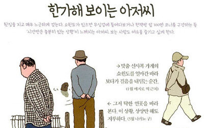 포토에세이 촬영을 위해 충북에 있는 한 징검다리를 찾았을 때 일이다. 내려다보는 앵글로 길어 보이게 찍으려고 맞은편 산 중턱으로 올랐다. 이제 사람들만 이 다리를 건너면 사진은 완성된다. 어린아이가 있는 가족들이 와서 깡충깡충 뛰면 더 좋겠거니 기대하고 있었다. 1시간가량 기다리니 드디어 한 무리의 관광객이 왔다. 10명이었는데, 부부 동반인지 중장년 남녀 각각 5명씩. 밝은색 옷을 입은 여성들이 앞장서 활달하게 징검다리를 건넜다. 찰칵찰칵. 사진 송고를 위해 철수한다. 문제는 사진을 정리하면서 생겼다. 촬영 당시엔 여성들을 보느라 몰랐는데 뒤에 있던 남성들이 문제였다. 어두컴컴한 점퍼 차림, 뒷짐을 지고 어기적어기적 걸음. 억지로 끌려나온 모습이다. 특히 뒷짐 모습은 사진가들에게 기피 대상이다. 무관심한 태도로 보이기 때문이다. 발랄한 분위기의 사진에선 인물의 동작이 중요한데, 이게 제일 약한 분들이 ‘아저씨’들이다. 사진기자들이 날씨 스케치 등을 할 때 중장년 남성들을 가급적 피