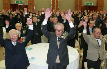 9日,韩国独立有功之臣协会和韩国光复军同志会会员们在汉城市白凡纪念馆举行了临时政府对日宣战61周年纪念仪式。仪式结束后,与会者们正在高呼三声“万岁!”