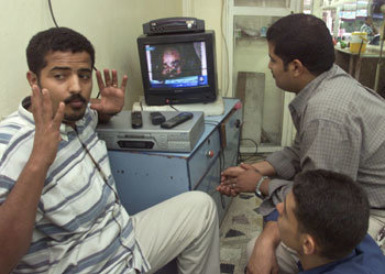 24日,伊拉克北部摩蘇爾市的市民們正通過電視觀看前總統薩達姆的兒子烏代和庫塞的屍體照片。