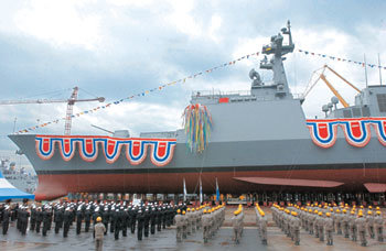 12日,韓國多功能驅逐艦事業的第3號艦“大祚榮艦”在慶南巨濟市大宇朝鮮海洋玉浦造船廠舉行的下水儀式上展示了威武的姿態。