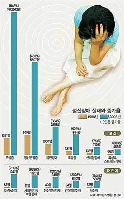 △憂鬱症患者、不能適應社會的兒童明顯增多:爲瞭解我國社會精神障礙疾病的現狀,本報分析了漢城新村SEVERANCE醫院1996~2003年度的精神疾病患者記錄。結果發現,患者人數從5342人猛增到29764人,增長倍數超過了5倍。特別是,兒童患者從367人暴增到5254人,足足增加了14倍,說明我國的小兒精神疾病患者在迅速增加。