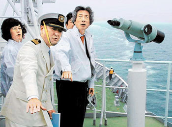 2日,日本首相小泉純一郎(右)視察了與俄羅斯引發領土紛爭的北方4島。在歷屆首相中,此次是第3次視察。與過去乘坐飛機視察不同,小泉純一郎乘坐海上保安廳巡邏艇,近距離視察了北方4島。這被解釋爲,面對明年俄羅斯總統普京訪日,把北方4島問題當作兩國的懸案。