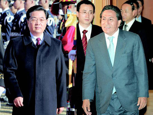 爲出席釜山APEC領導人非正式會議,16日訪韓的中國國家主席胡錦濤(左)和秘魯總統托萊多(右)當天訪問青瓦台,與盧武鉉總統舉行了首腦會談。盧武鉉總統將于17日在慶北慶州市與美國總統布希舉行首腦會談。