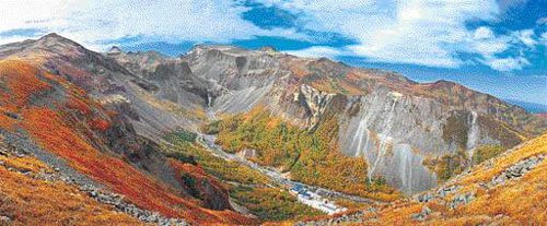像個冷漠的小夥子的白頭山在秋季也變得火熱。圖爲,17日從白頭山天文峰(音譯)下到土風口(音譯)的路上,用相機捕捉到的畫面。照片中央沿著多條分支奔流而下的白色水柱是源自天池的水。從長白山瀑布落下,流入松花江。覆蓋白頭山英勇的肌肉的紅色毛毯一般的樹木,是白頭山的特産“越橘酒”的原料——越橘樹。