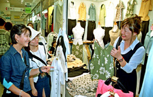 在漢城東大門市場‘FREYA TOWN’做衣服生意的朴善淑(右邊)正用日語對日本顧客介紹衣服.