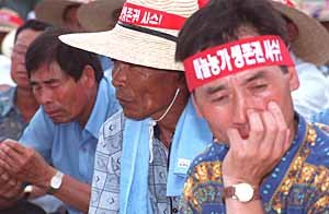21日﹐在政府辦公大樓前面﹐不滿意進口中國大蒜緊急關稅協商結果﹐農民們抗議政府以低關稅進口中國產大蒜的政策﹐進行示威活動. 因酷暑累坐在地上.